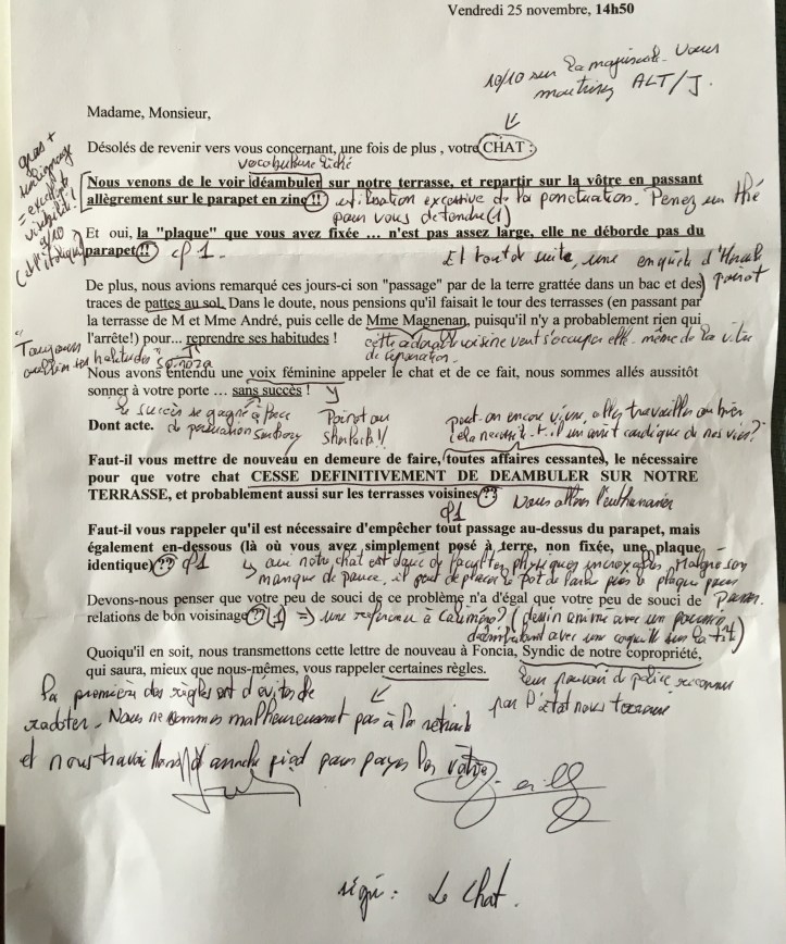 Lors de notre premier échange sur le balcon avec Monsieur, avait été très clair. Au bout de dix minutes de monologue sur divers aspects de la vie et de la résidence, il nous a avoué que la présence du chat posait soucis.