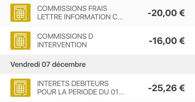 En cette veille de Noël, je note avec stupeur une série de « commissions d’interventions » répétées et exorbitantes (16 euros, 8 euros, 25,26 euros etc) sur ce compte alors que l’ensemble de mes autres comptes sont dans le positif. Il est à noter que ces « commissions d’interventions » ont eu pour « démarrage » un solde débiteur de 3,78 euros. J’aimerai savoir précisément à quels commissions exactes et sur quels justificatifs légaux se basent les fondements de ce racket.