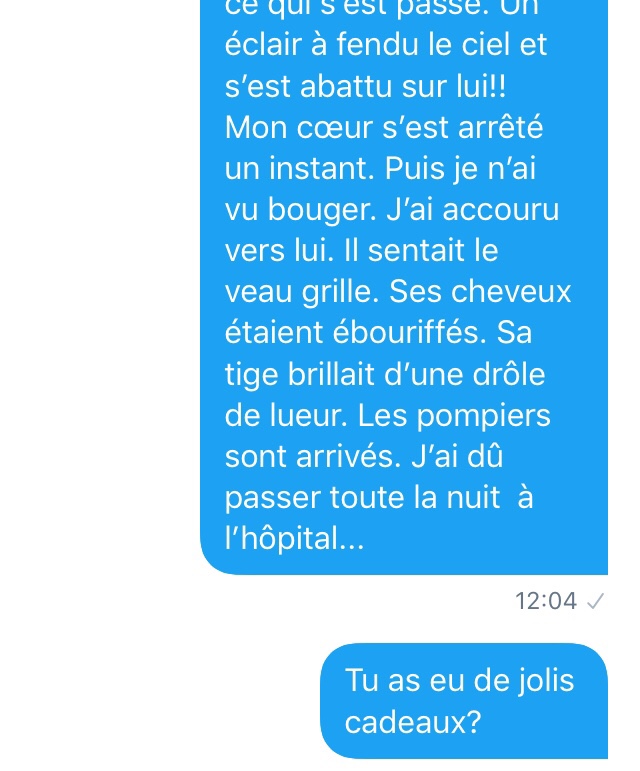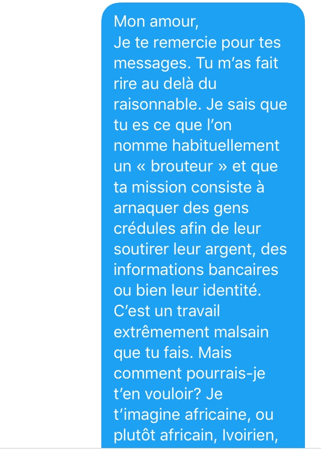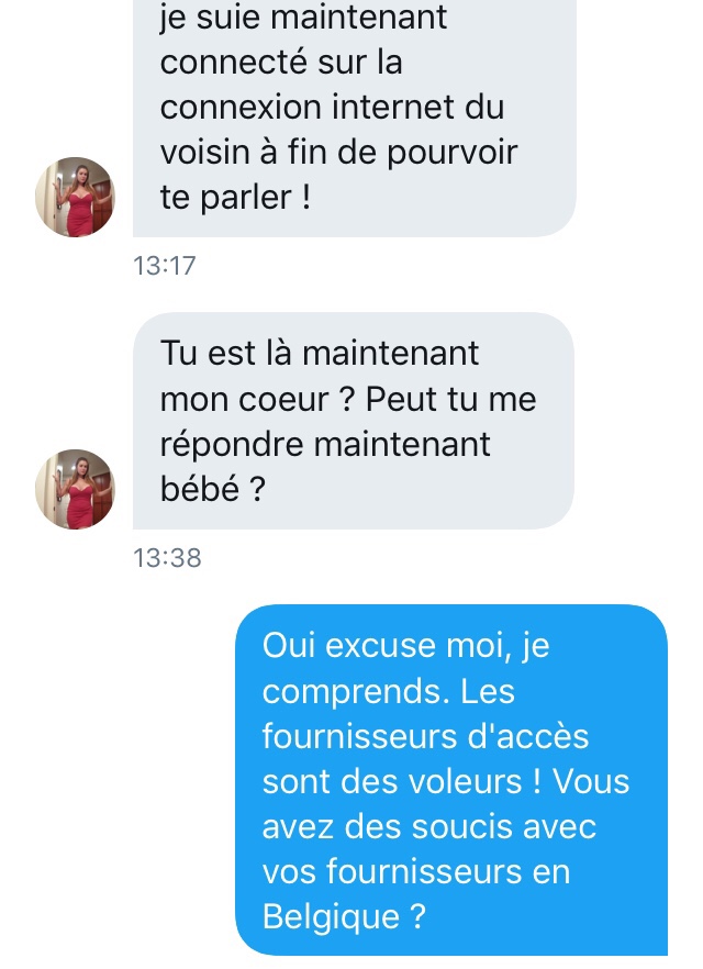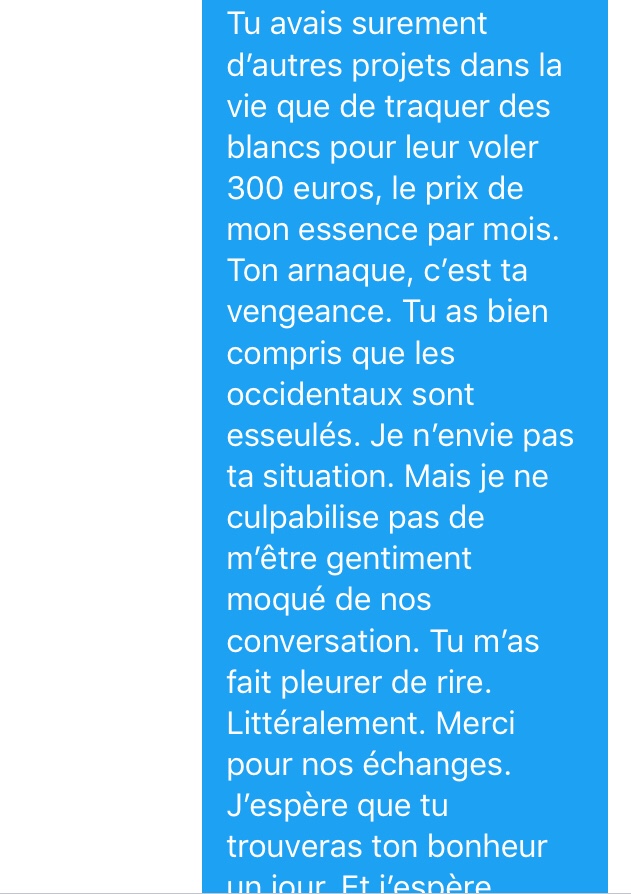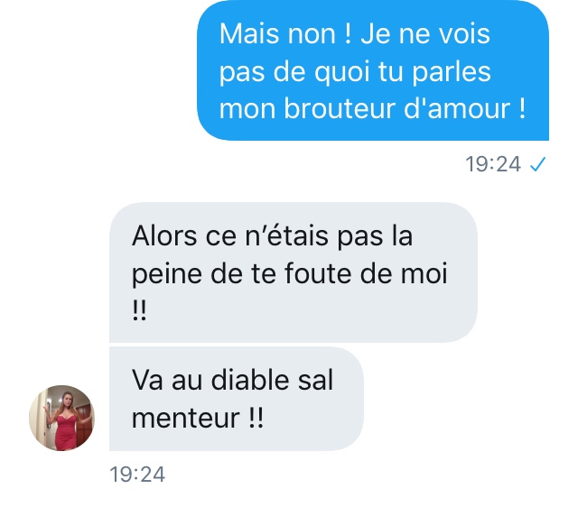 Là, je pensais que l’histoire était terminée avec classe. Le malfrat démasqué aurait pu dire « merci », mais non. C’était sans compter que sa bêtise. Alors, il a tenté de revenir. Évidemment, je l’ai accueilli avec le plus grand plaisir 🙂