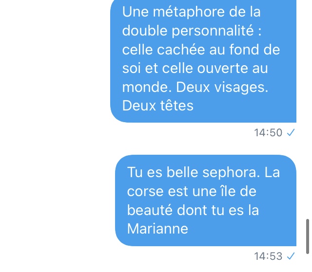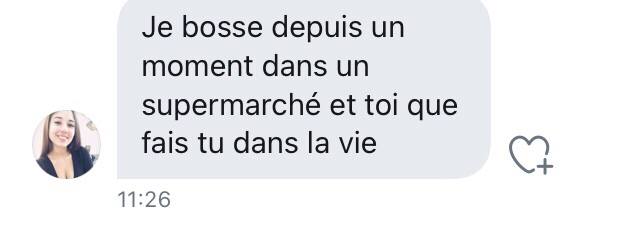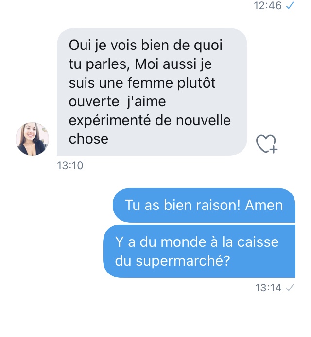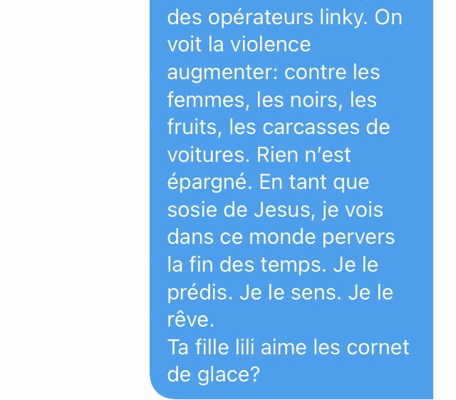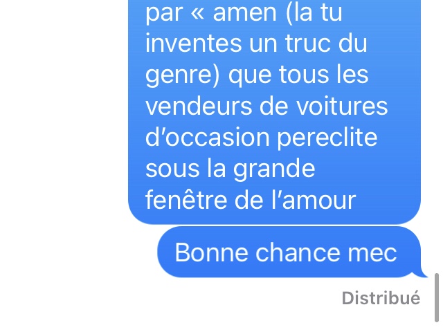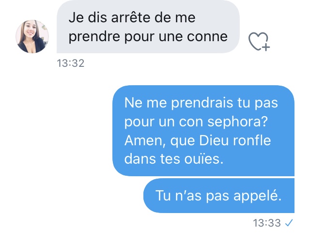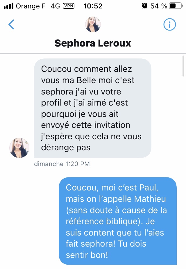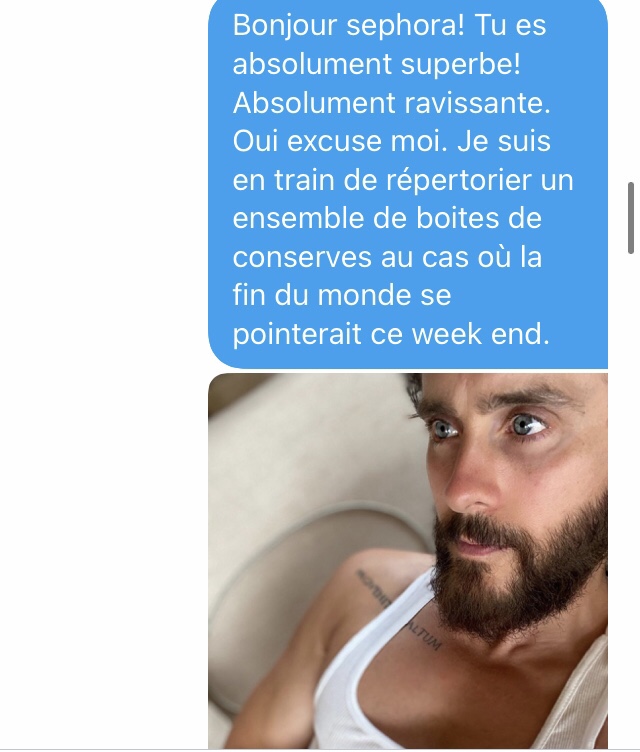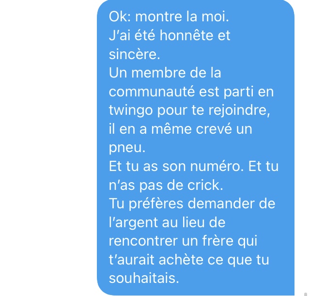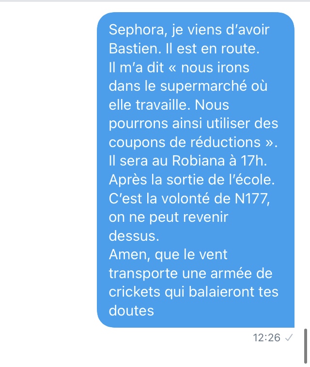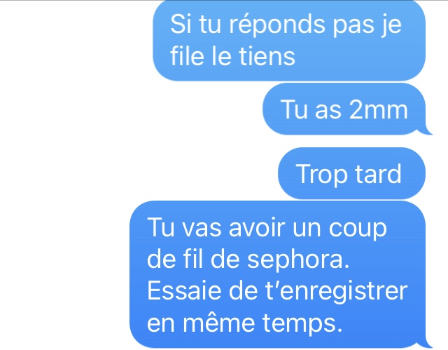 Là, je suis emmerdé. De très naïve (déterminée dans sa fausse naïveté face à un type qui semble fou a lier), elle veut un numéro de téléphone. J’envoie un SMS à un ami pour le prévenir que je vais donner son numéro) Séphora.