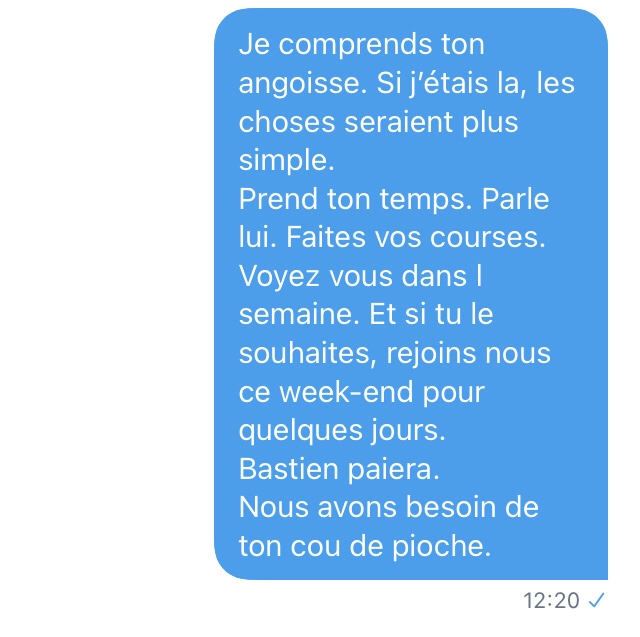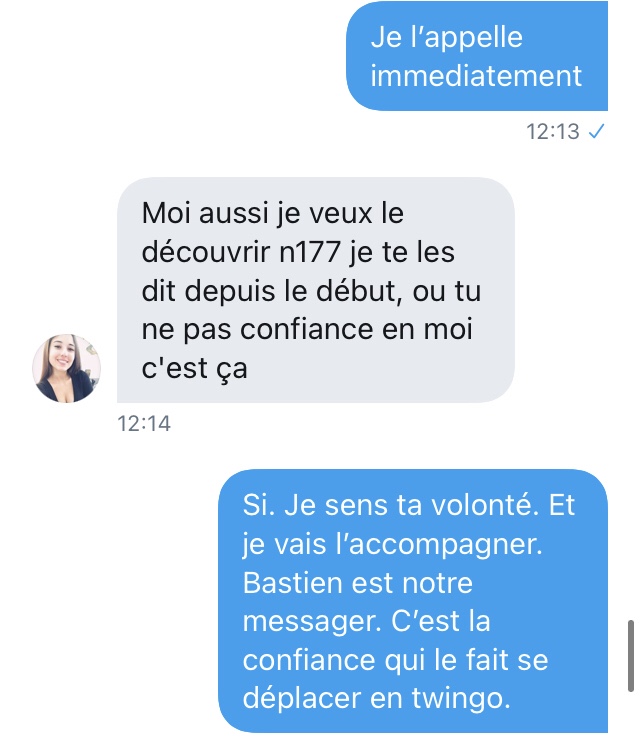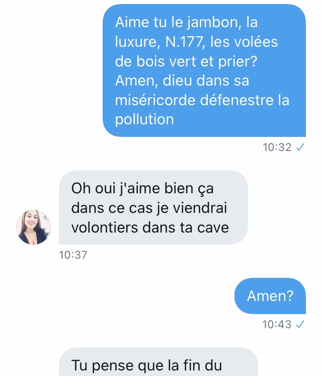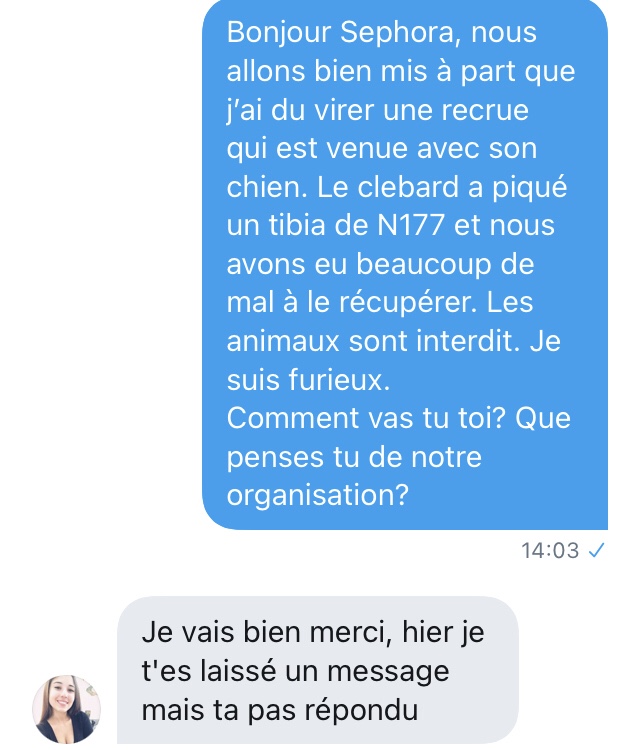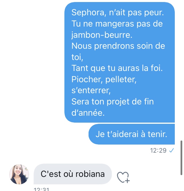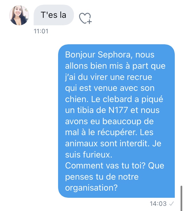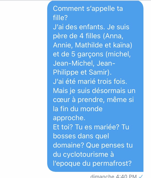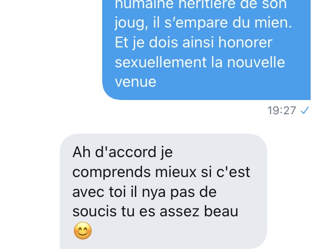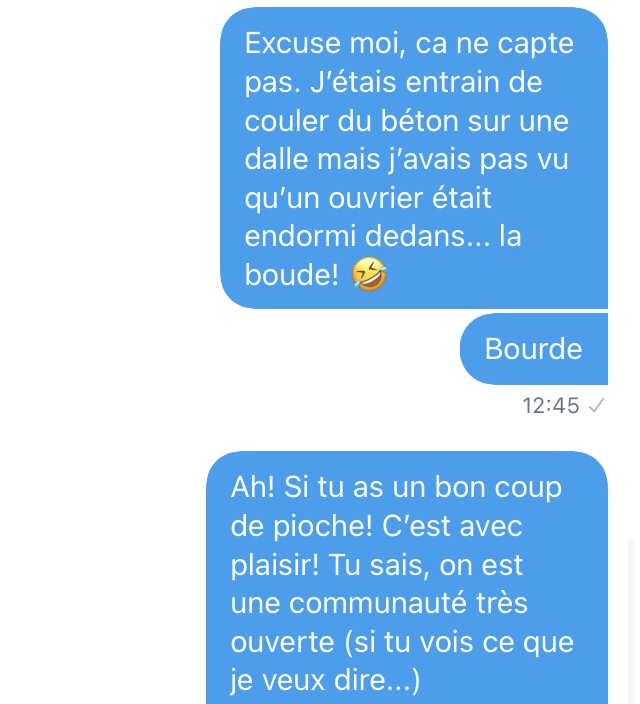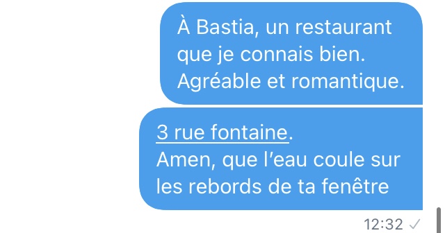 Là, je suis emmerdé. De très naïve (déterminée dans sa fausse naïveté face à un type qui semble fou a lier), elle veut un numéro de téléphone. J’envoie un SMS à un ami pour le prévenir que je vais donner son numéro) Séphora.