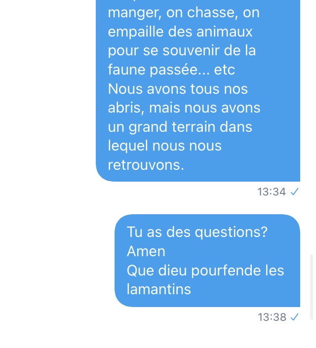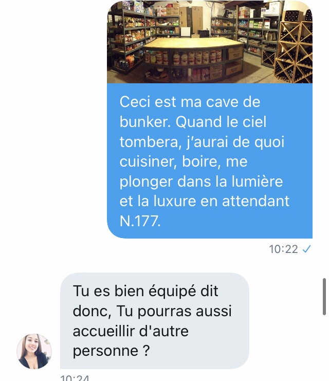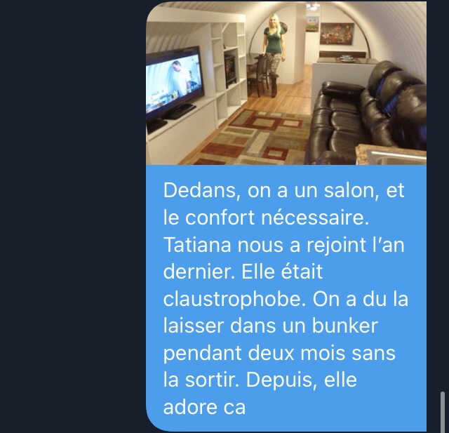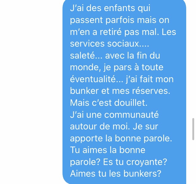 Cette fois, j’ai décidé de jouer le rôle d’un complotistes vivant dans une secte survivaliste.
