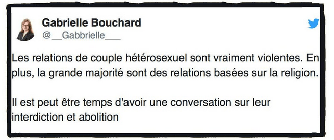 « Ne pas avoir un mari, ça m’expose plutôt à ne pas être violée, ne pas être tuée, ne pas être tabassée. Et ça évite que mes enfants le soient aussi. Faut-il rappeler quelques chiffres sur les pères? C’est un petit peu dramatique que l’on brandisse cette référence paternelle comme ça, sans savoir la réalité » (Russia Today) (Alice Coffin, déléguée EELV, expliquait en septembre 2018 lors d’un débat sur la PMA).