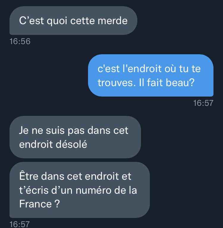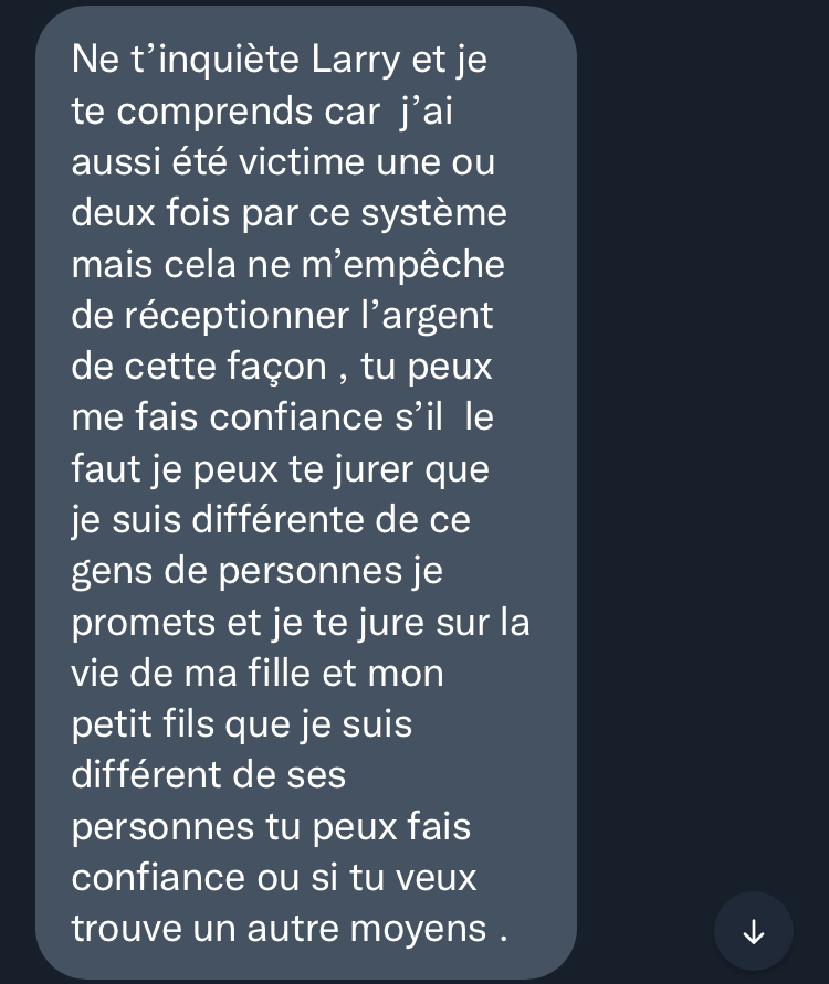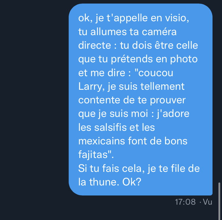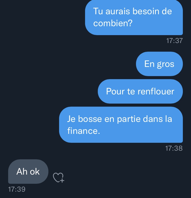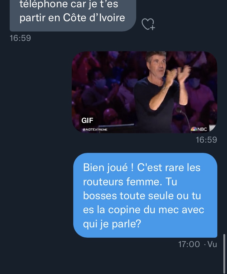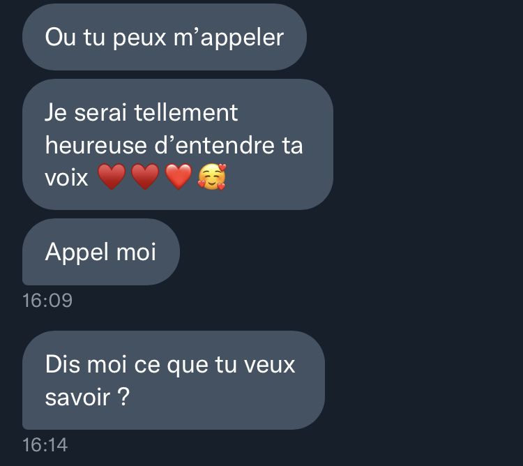 Exceptionnel, hilarant! Quelle farce! Je connaissais le probleme avec les rares victimes qui ont réussi à dépasser leur honte pour franchir la porte de la brigade. Je n’ai jamais eu d’homme, seulement des femmes que l’amour d’un inconnu virtuel avait fait dépenser des sommes importantes. Là je vois le mal par l’autre lucarne. Pas de surprise, c’est toujours le même schéma. C’est tellement gros que je me dis qu’il faut vraiment être perdu pour se laisser avoir…