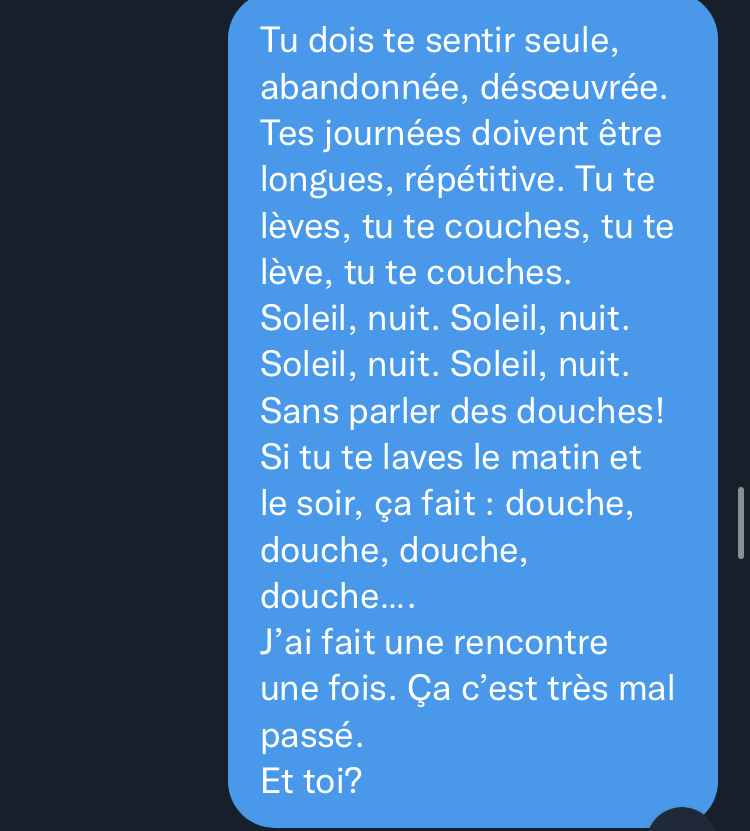 Parce que je m’ennuie. La vie est trop dur. Se lever puis se coucher puis se lever puis se coucher puis se lever puis se coucher puis se lever puis se coucher puis se lever puis se coucher puis se lever puis se coucher puis se lever. J’en ai marre. Pas toi?