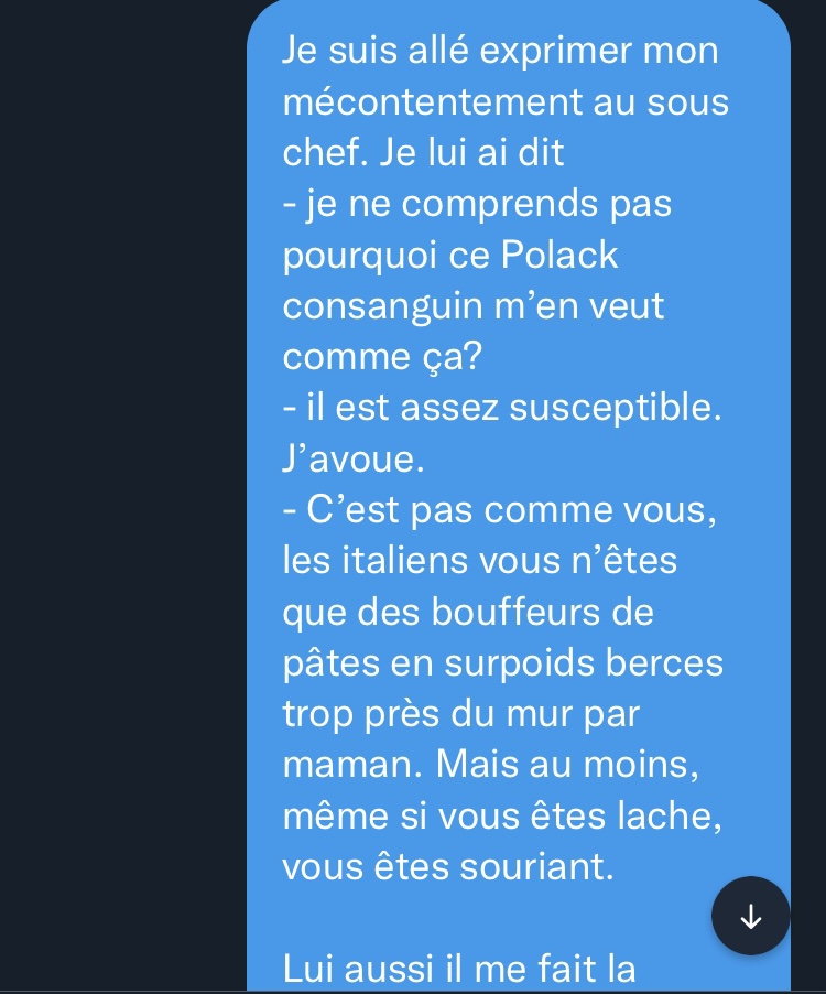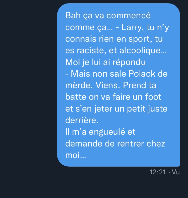 -Larry, tu n’y connais rien en sport, tu es raciste et alcoolique. – Mais non sale Polack de merde ! Prends ta batte ! On va se faire un foot avant de s’en jeter un petit juste derrière » Il m’a engueulé et demandé de rentrer chez moi.