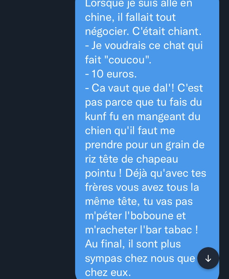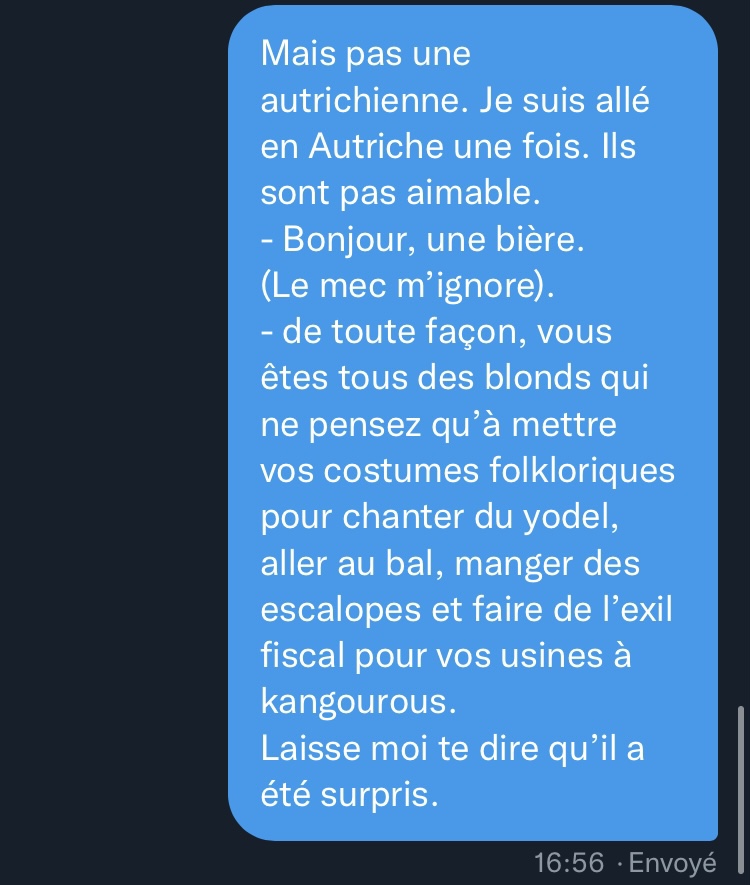 Et puis ce tour du monde caricatural quel bonheur. Si j’avais ce don à imager les mots comme tu nous as régalé, j’irai plus loin. Je ferai un guide du touriste….je l’appellerai « le Broutard » puisque « le Routard » est deja pris 😂. Je rajouterai les Allemands avec leurs grosses BM, leur gros bide et leur choucroute,…les Britaniques avec leur fairplay, leur thé, leur brunch et leur conduite à gauche, etc…